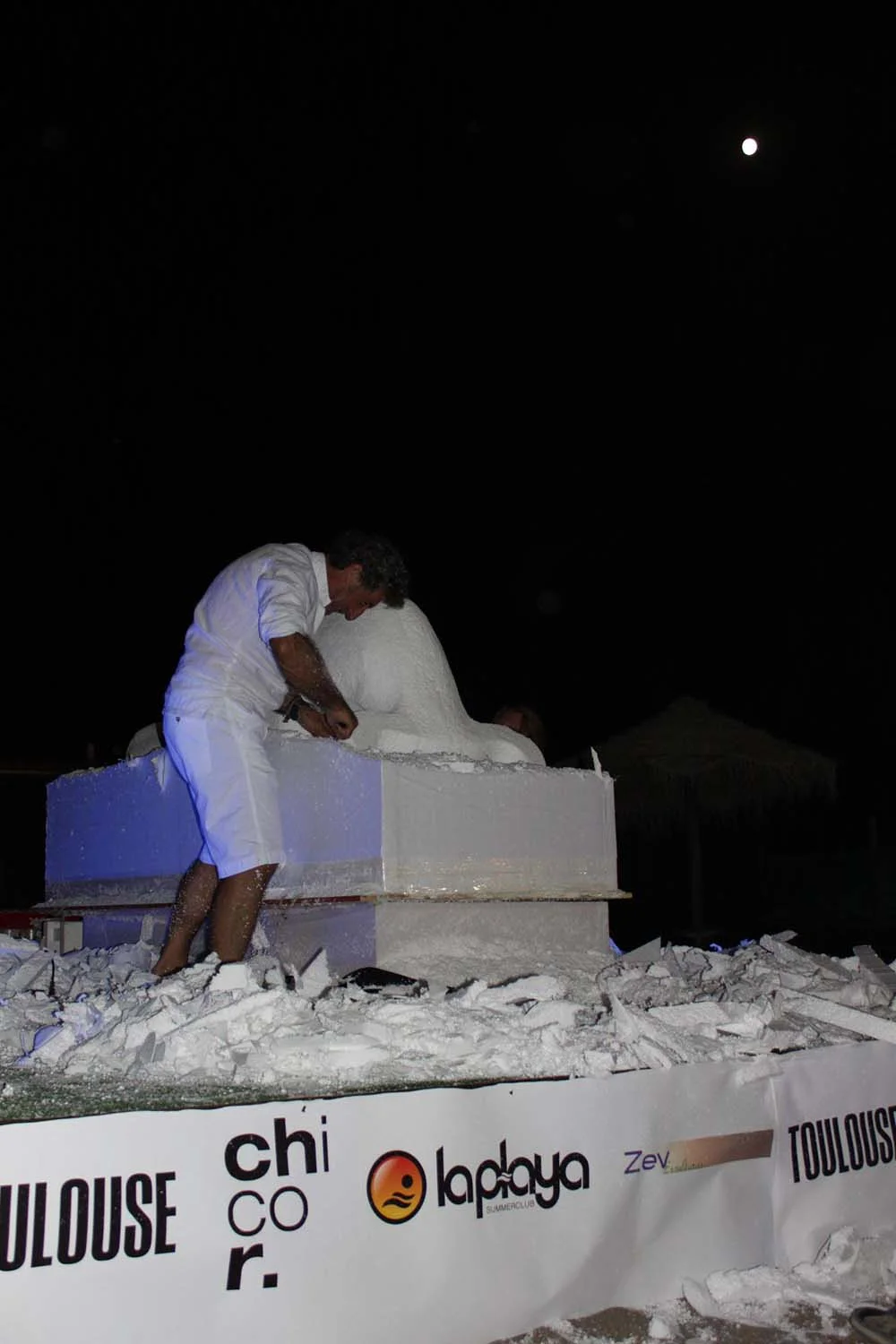 Con motivo de la celebración de la clásica noche de san Juan, El artista Chico Repullo lleva a cabo una performance en el Club de playa “La Playa Summer Club”, ayudado por el escultor Jesús Vez. La puesta en escena supuso un fuerte contraste entre una cálida noche de verano y el aspecto gélido que trasmite el material empleado en la intervención. Al tratarse de un material altamente tóxico, no pudo quemarse para conformar la hoguera, razón por la cual el artista optó por un golpe de efecto, un tanto transgresor, para provocar al espectador. Una vez terminada la figura taurina, los artistas simulan la suerte de matar introduciendo el estoque en la pieza, por la que comienza a brotar un líquido rojo que simula la sangre del animal, produciéndose un fuerte contraste entre el blanco del material y el color rojo.